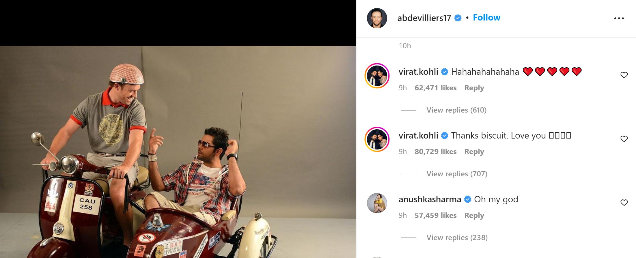 But what caught the attention of netizens was de Villiers' Instagram post. The former South Africa captain posted an old photograph with Kohli in which both the legendary cricketers are sitting on a scooter. De Villiers is in the rider's position while Kohli was in the sidecar.